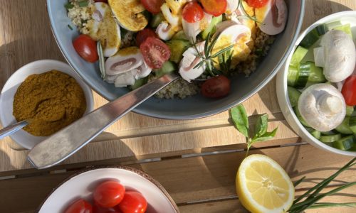 - Pour la vinaigrette : dans un bol, mélangez l’huile d’olive, le jus d'un citron jaune, le curry et les herbes aromatiques. Salez et poivrez.