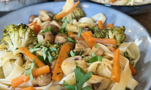 - Disposez les pâtes dans une assiette creuse, ajoutez les légumes et parsemez de persil frais.
